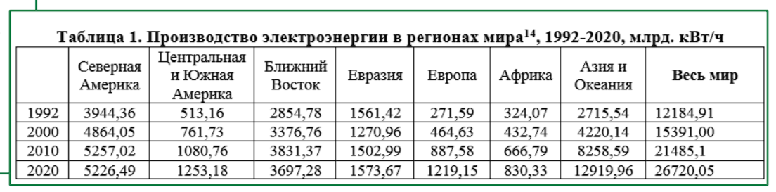 - Таблица 1. Производство электроэнергии в регионах мира.
