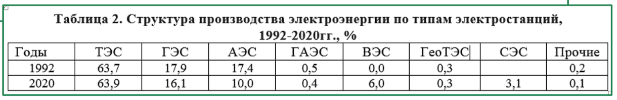 - Таблица 2. Структура производства электроэнергии по типам электростанций.