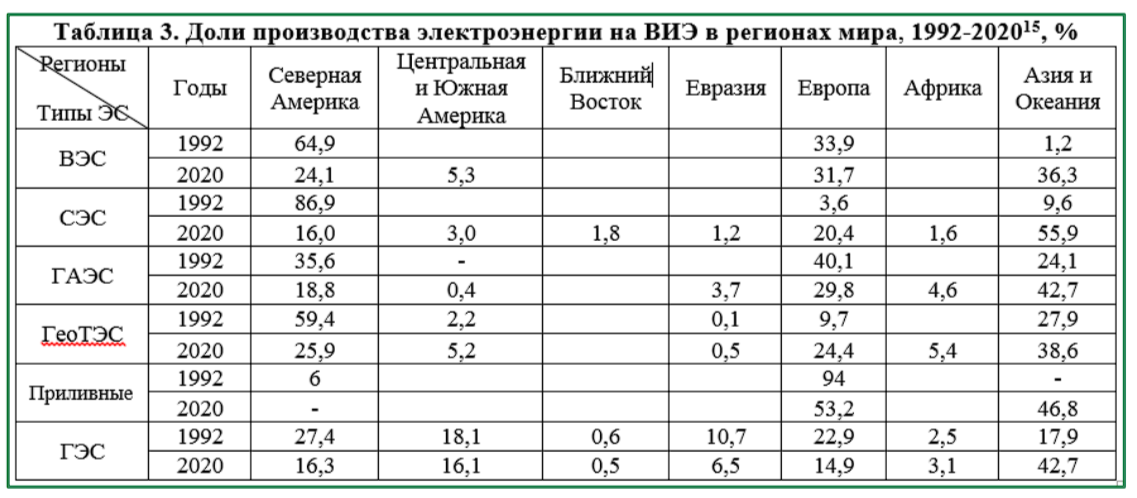 - Таблица 3. Доли производства электроэнергии на ВИЭ в регионах мира.