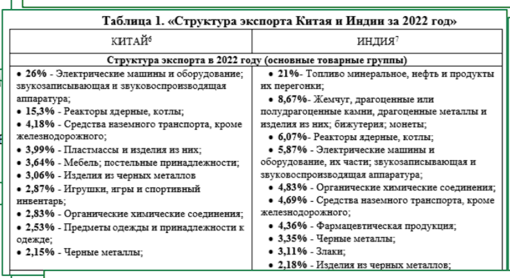 - Таблица 1. «Структура экспорта Китая и Индии за 2022 год»