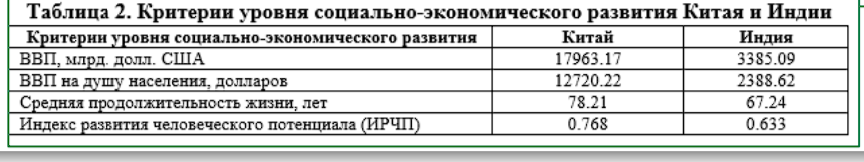 7. Сравните Китай и Индию по уровню социально-экономического развития. Используйте для выполнения задания данные Таблицы 2. «Критерии уровня социально-экономического развития Китая и Индии».