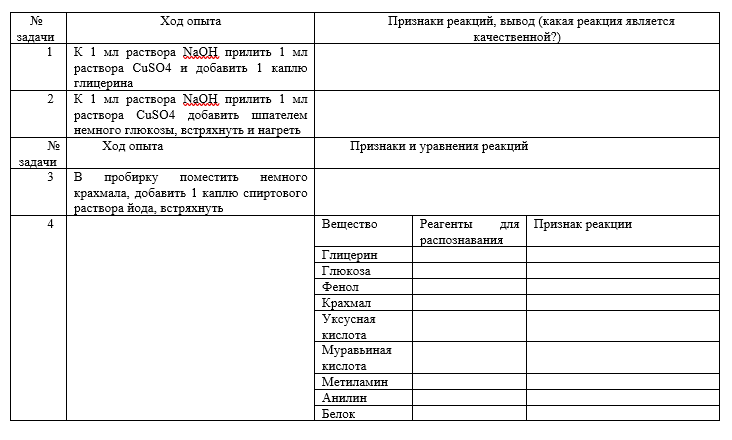 Реактивы: раствор NaOH, раствор CuSO4, глицерин, глюкоза, фенол, крахмал, уксусная кислота, муравьиная кислота, метиламин, анилин, белок