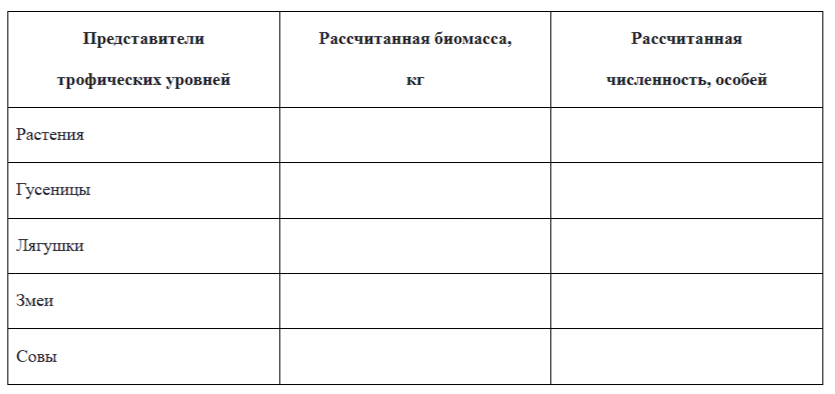 Данные для работы: биомасса всех травянистых растений — 40 000 кг; одного побега травянистого растения — 5 г (0,005 кг); гусеница — 2 г (0,002 кг); лягушки — 20 г (0,02 кг); змея — 150 г (0,15 кг); сова — 2 кг.