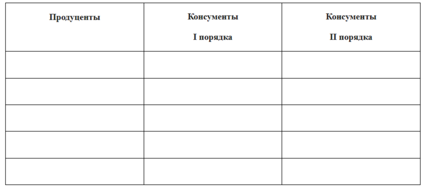 Распределите организмы из приведенного перечня на три группы: продуценты, консументы первого порядка, консументы второго порядка. Результат представьте в виде табл. 1.