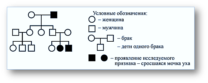 В медицинской генетике широко используется генеалогический метод. Он основан на составлении родословной человека и изучении наследования того или иного признака. В подобных исследованиях используются определённые обозначения. Изучите фрагмент родословного древа одной семьи, у некоторых членов которой сросшаяся мочка уха.