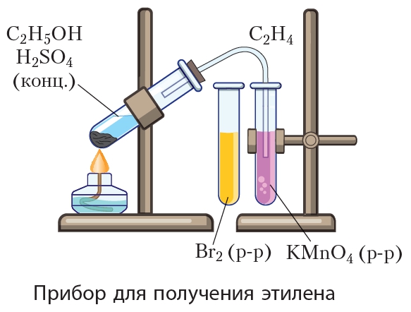 Оборудование: Прибор для получения газов, водный раствор перманганата калия, раствор брома в воде (бромная вода), реакционная смесь этилового спирта и серной концентрированной кислоты (1:3), спиртовка, спички.